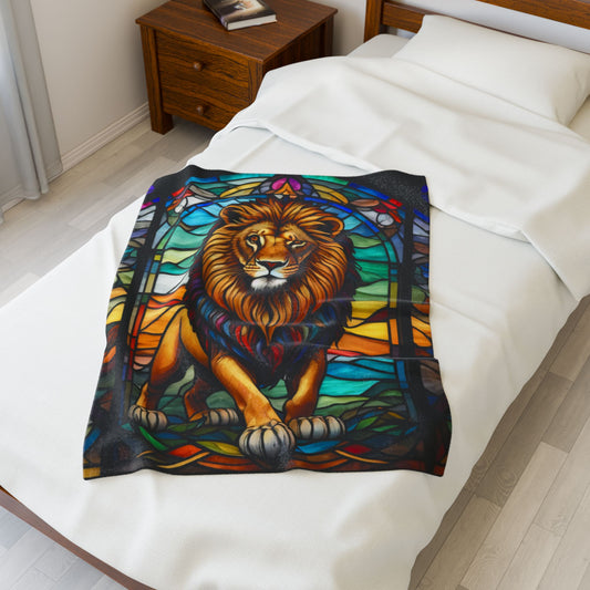 A velveteen plush blanket with vibrant animal illustrations on colorful, stained glass–inspired backgrounds. Soft, medium-weight fabric offers warmth and comfort while adding style. Part of the Animal Kingdom Stained Glass Designs collection, these blankets bring nature-inspired beauty to any room - perfect for cozy evenings, décor, or gifting.