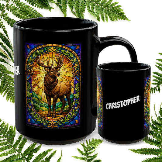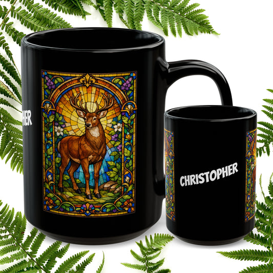 Deer Stained Glass Black Ceramic Mug - Personalized Woodland Wildlife Art Coffee Mug Nature Gift