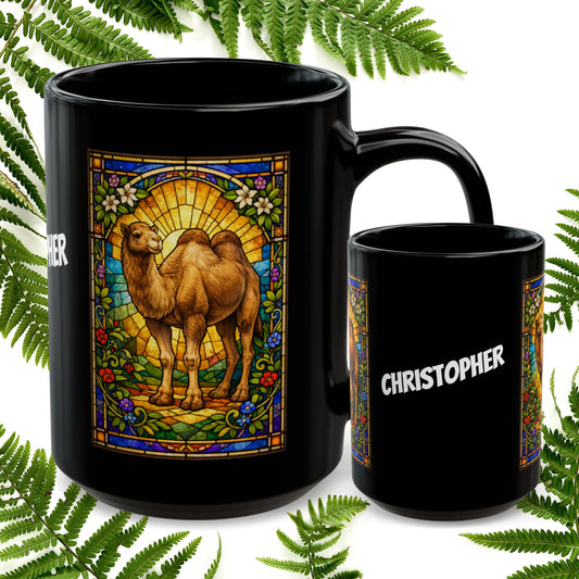 Camel Stained Glass Black Ceramic Mug - Personalized Zoo Animal Art Coffee Mug Gift