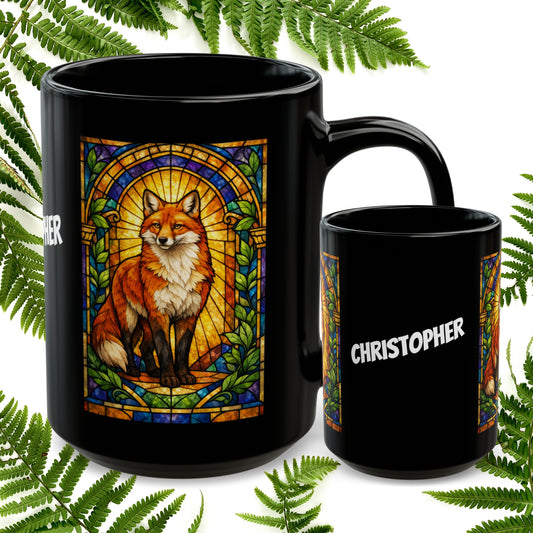 Fox Stained Glass Black Ceramic Mug - Personalized Woodland Animal Art Coffee Mug Gift