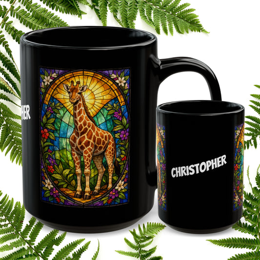 Giraffe Stained Glass Black Ceramic Mug - Personalized Safari Wildlife Art Coffee Mug Gift