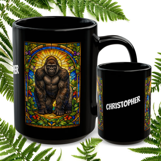 Gorilla Stained Glass Black Ceramic Mug - Personalized Wildlife Art Coffee Mug Nature Gift
