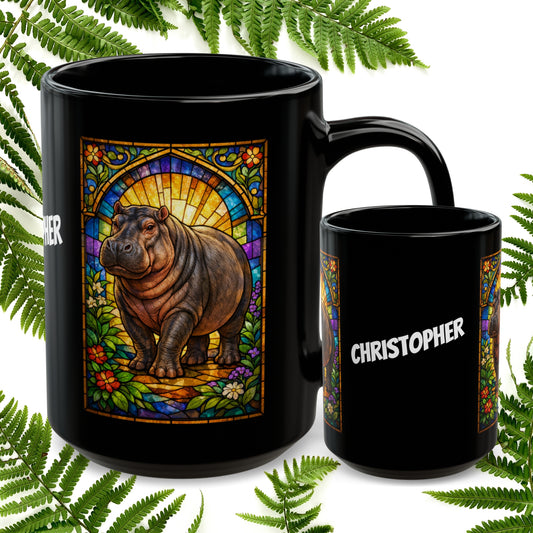 Hippopotamus Stained Glass Black Ceramic Mug - Personalized Zoo Animal Art Coffee Mug Gift
