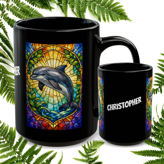 Dolphin Stained Glass Black Ceramic Mug - Personalized Ocean Wildlife Art Coffee Mug Gift
