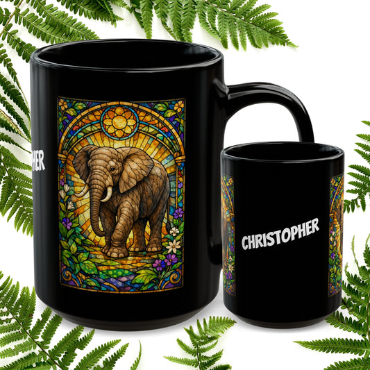 Elephant Stained Glass Black Ceramic Mug - Personalized Safari Animal Art Coffee Mug Gift