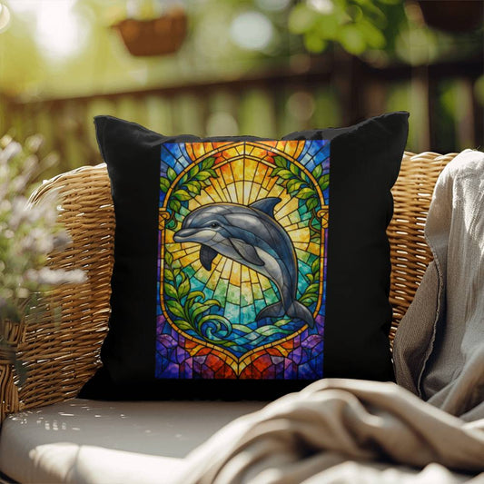 Dolphin Stained Glass Throw Pillow - Coastal Wildlife Decor Accent Cushion