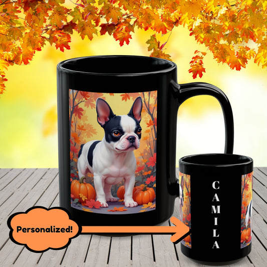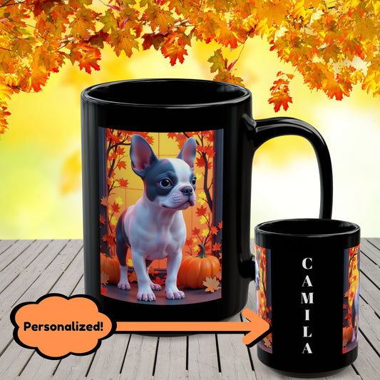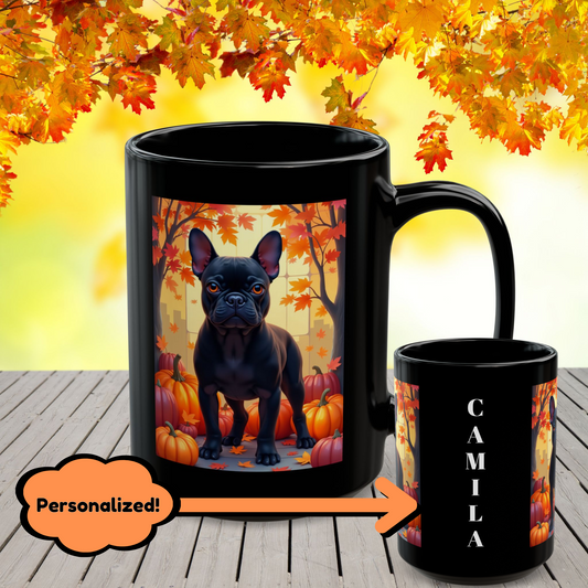 French Bulldog Blue - Autumn Black Mug, Cute Fall Drinkware for Dog Owners