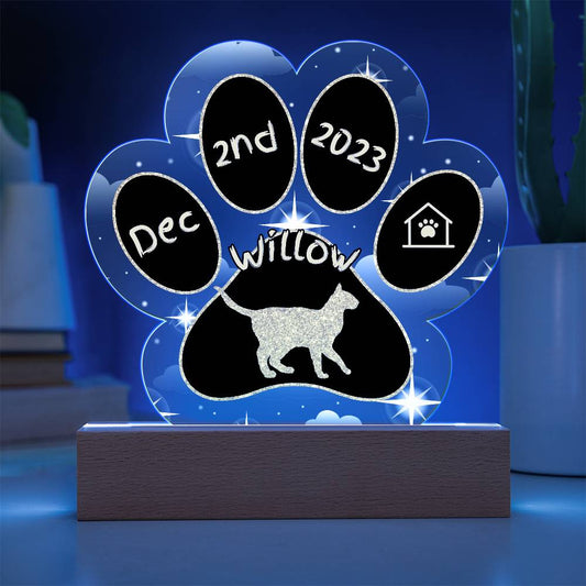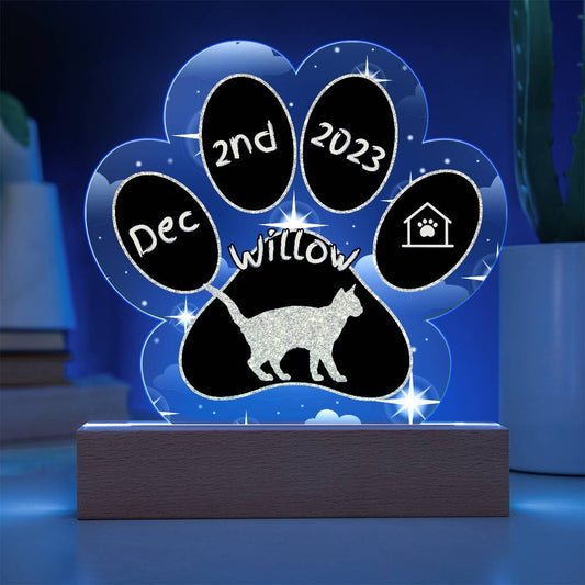 Commemorate your cat’s Gotcha Day or birthdate with a personalized 7" Acrylic Paw Print Plaque! This custom LED keepsake features vibrant colors, high-quality printed designs, and a gentle glow, making it the perfect gift for cat lovers. Personalize it with your pet’s name and special date to create a unique, heartwarming piece of home décor or a thoughtful gift that captures the love and bond with your furry friend.