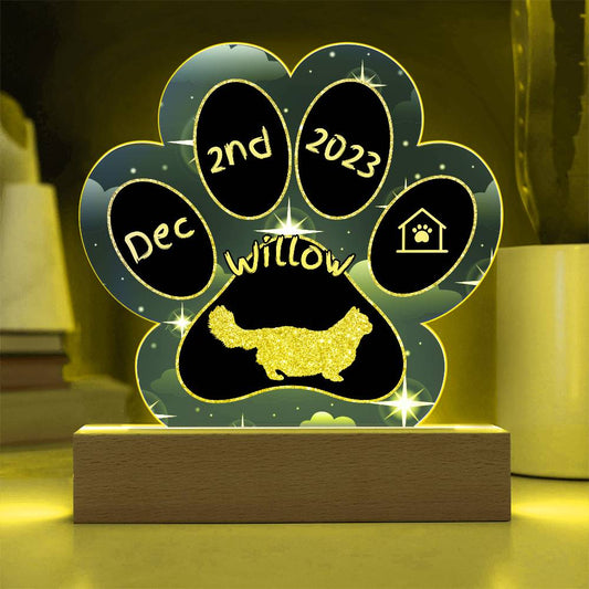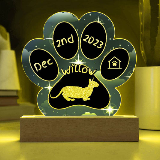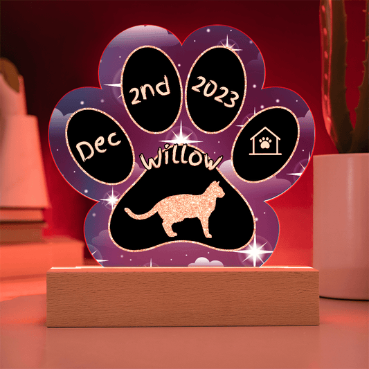 Commemorate your cat’s Gotcha Day or birthdate with a personalized 7" Acrylic Paw Print Plaque! This custom LED keepsake features vibrant colors, high-quality printed designs, and a gentle glow, making it the perfect gift for cat lovers. Personalize it with your pet’s name and special date to create a unique, heartwarming piece of home décor or a thoughtful gift that captures the love and bond with your furry friend.