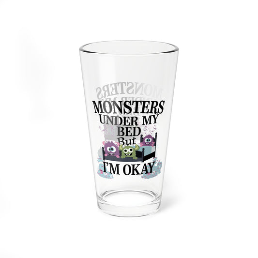Monsters Under My Bed But I'm Okay Halloween Pint Glass 16oz - Spooky Fun & Humor