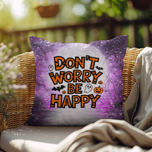 Don't Worry Be Happy Halloween Indoor Outdoor Skeleton Throw Pillow